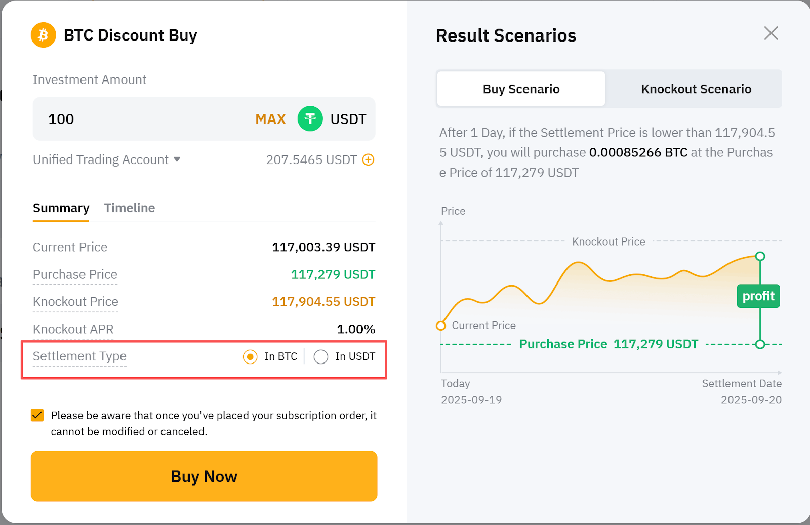 Buy Scenario: You will buy BTC at the Purchase Price and sell it at the Settlement Price, receiving the final payoff in USDT.