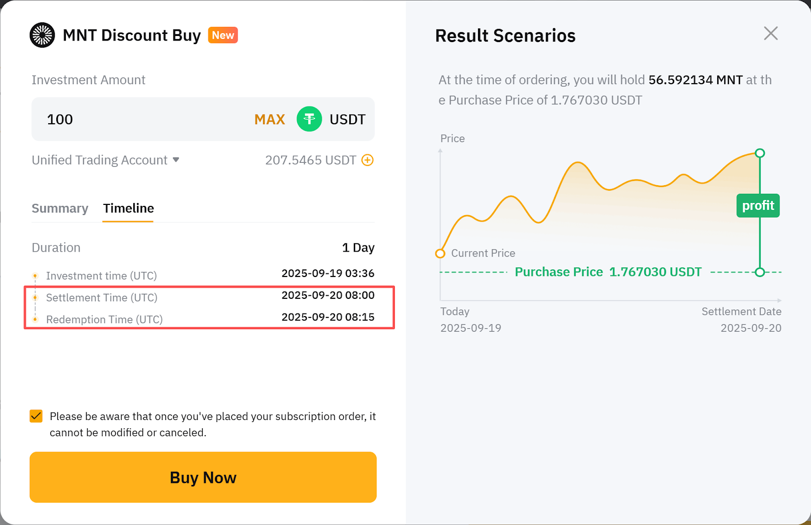 For MNT products, once your subscription is successful, your funds are immediately locked as MNT holdings. During the lock-up period, you enjoy all MNT holder benefits. There is no Knockout Price — at maturity, you will always buy MNT at your preset Purchase Price, regardless of market fluctuations.