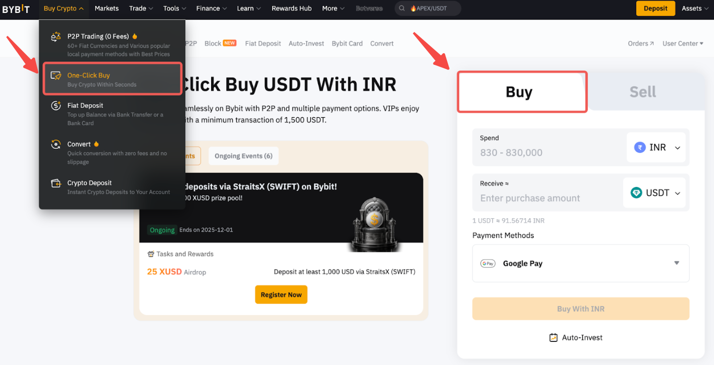 Step 1: Click on Buy Crypto → One-Click Buy at the top left corner of the navigation bar to enter the Buy function page.