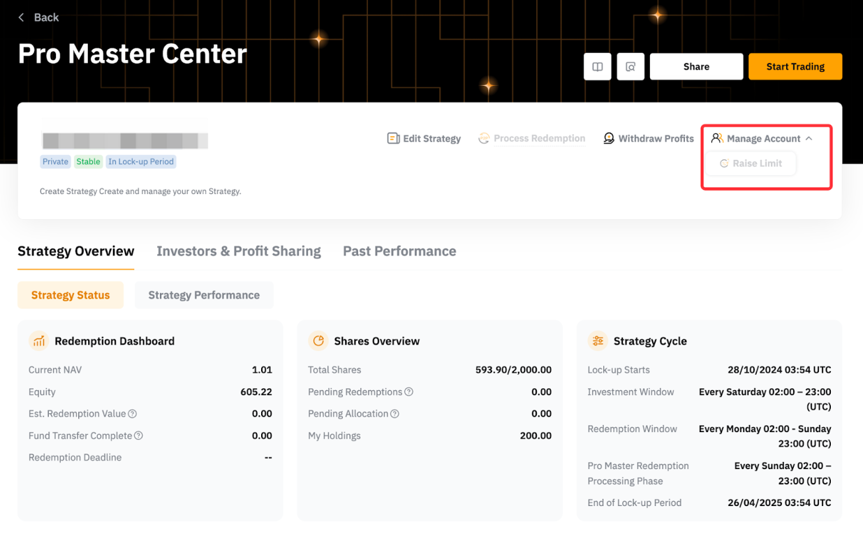 For example, your current strategy’s share limit is 500,000 shares and the current NAV is 1.05. Assuming the Min. Master Balance is 10%, to increase your share limit to 1 million, you have to contribute an additional 52,500 USDT to your strategy [(1,000,000 - 500,000) x 1.05 x 10%].