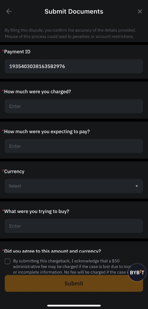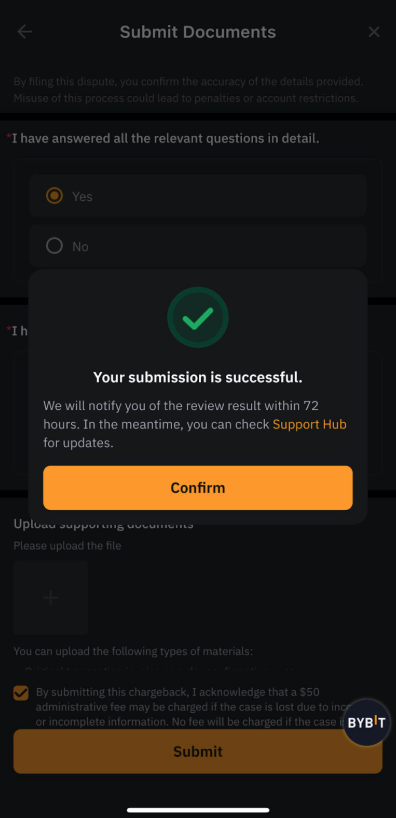 Note: Bybit will make the final decision based on the information and evidence you provide. If your dispute is rejected, you will be notified via email. Kindly be aware that you cannot submit a second chargeback request for the same transaction.