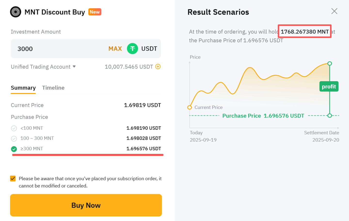 Regardless of the Settlement Price, Trader B will purchase MNT at 1.696576 USDT on the settlement date, receiving approximately 1,768.267380 MNT (3,000 ÷ 1.696576). Trader B will enjoy all MNT holding benefits from the 1,768.267380 MNT immediately upon subscription. The MNT assets will be available for use after a 1-day lock-up period.