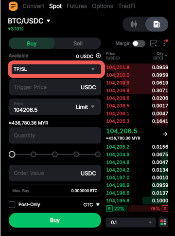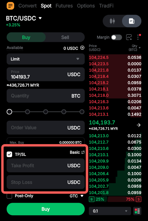 In addition to placing a Limit order, traders have the option to include a set of TP or SL orders. Once the Limit order is executed, the TP and SL orders are automatically placed based on pre-set prices and the specified order quantity.