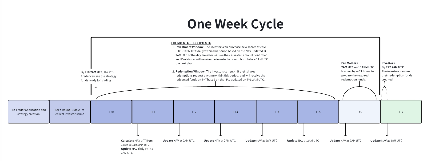 • Suppose “T” lands on a Monday: Investors can purchase additional shares between 2 AM UTC and 11 PM UTC from Monday to Saturday. To redeem shares, investors may submit redemption requests anytime from 2 AM UTC on Monday until 11 PM UTC on Saturday. The Pro Master sorts out the necessary redemption funds on Sunday, and by the following Monday, the funds are credited to the investors' accounts.