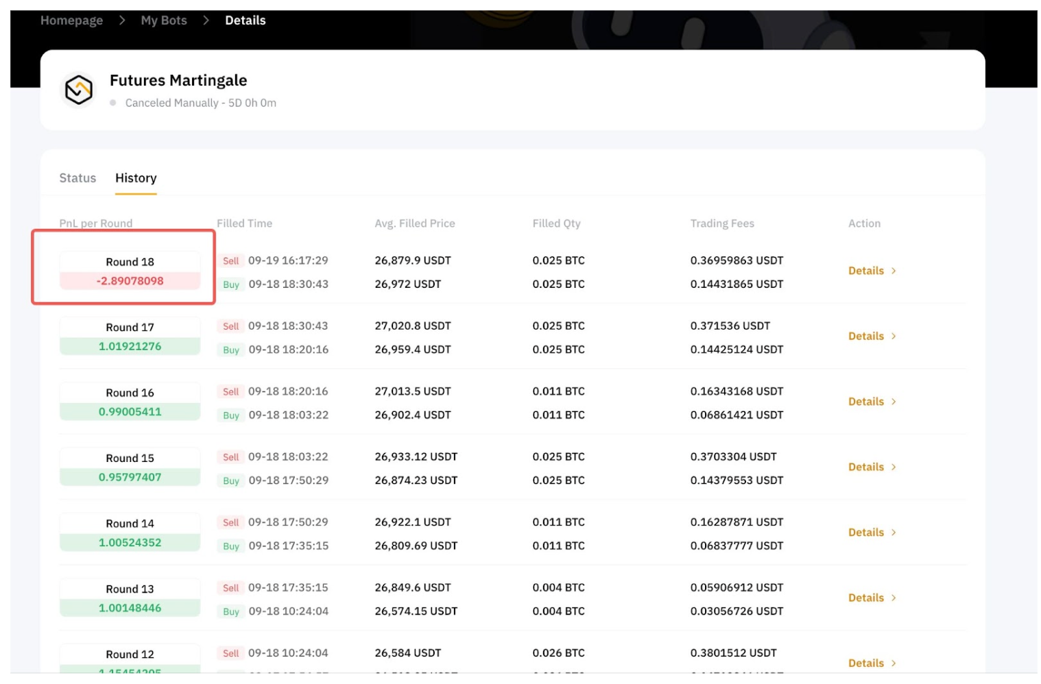 Accede a Mis bots para ver todas las rondas de trading activas y completadas. Haz clic en Detalles para ver los detalles de tu operación, incluidas las ganancias, el APR total y las ganancias realizadas.
