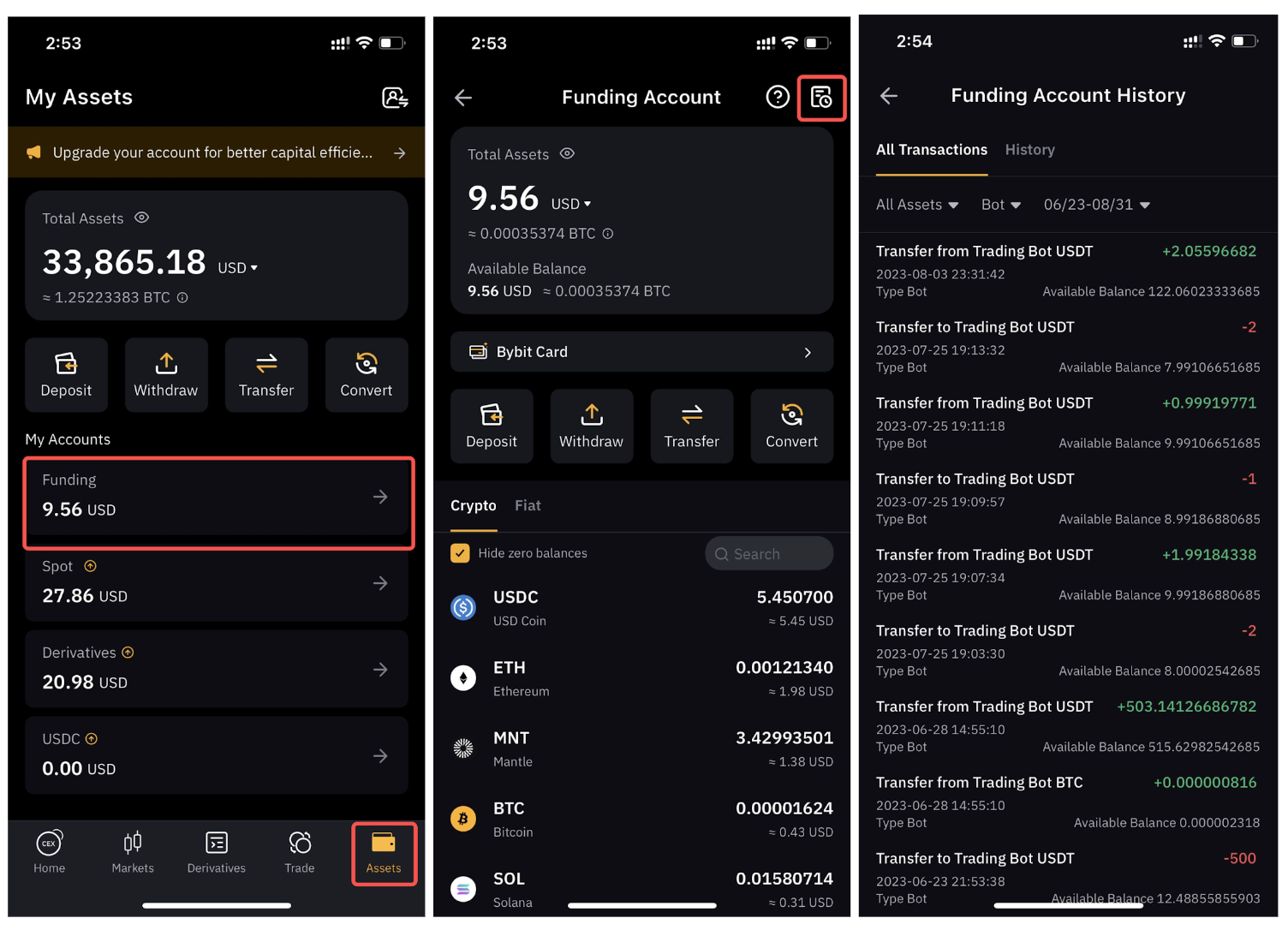 En la aplicación, ve a Activos → Cuenta de financiación, toca el icono Historial ubicado en la esquina superior derecha y podrás ver los registros de transferencia hacia o desde el trading bot en tu Historial de cuenta de financiación.