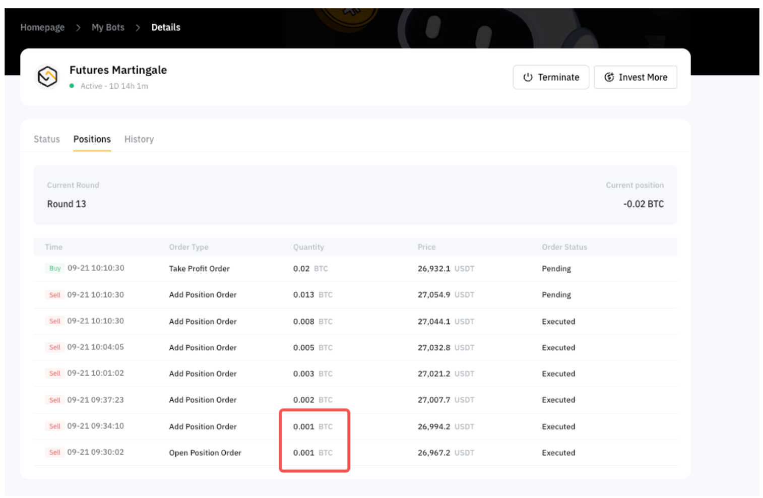 1. El bot de futuros Martingale de Bybit aplica tu multiplicador preestablecido al coste de la última orden en lugar de a la cantidad de la orden. Por lo tanto, la cantidad de la orden actual puede no ser necesariamente un múltiplo preestablecido de la orden anterior.