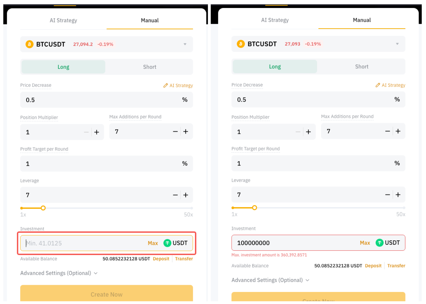 Una vez creado el bot correctamente, los parámetros no se pueden ajustar a menos que finalice el bot existente y se cree uno nuevo. Solo se puede ajustar el stop loss después de crear el bot. En caso de margen insuficiente, puedes transferir más fondos a tu trading bot. Sin embargo, los fondos agregados solo se utilizarán para mantener tu posición o cubrir cualquier saldo insuficiente para enviar órdenes. No aumentará el tamaño total de la orden de tu bot.