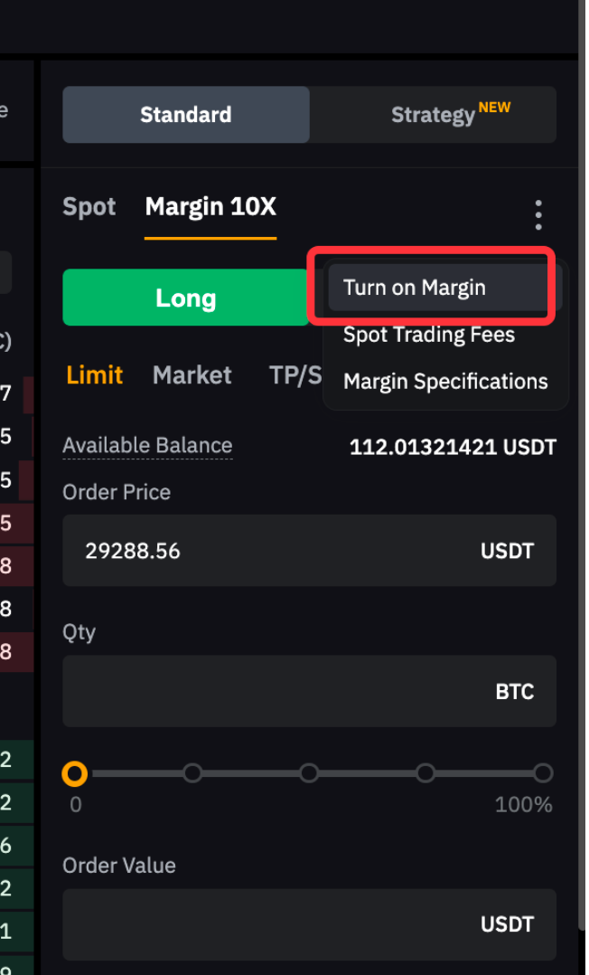 Sí, es posible tomar fondos prestados para operar en el Spot a través de la función Spot Margin Trading. Para activarla, vaya a la pestaña Margen de la zona de órdenes y active la opción Trading con margen.