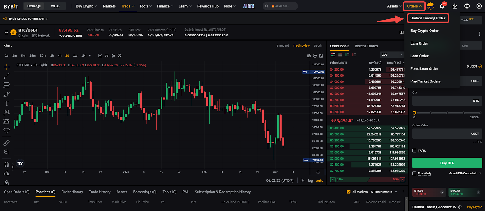 En el sitio web de Bybit, haz clic en Órdenes → Orden de trading unificada para ver tu historial de órdenes.