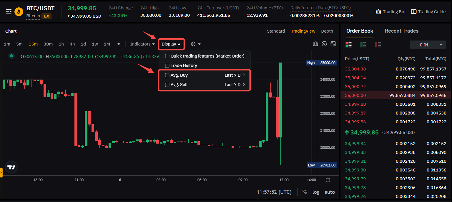 Cuando se opera en Spot, puede ver el precio promedio de sus órdenes de compra y venta directamente en el gráfico de trading. Para activarlo, haga clic en Mostrar y marque el precio promedio que desea ver. También puede seleccionar el periodo sobre el que se calculará la cotización media (últimos 7, 30, 60 ó 90 días). Tenga en cuenta que el precio promedio se calculará desde el día actual hasta el último día del periodo seleccionado.