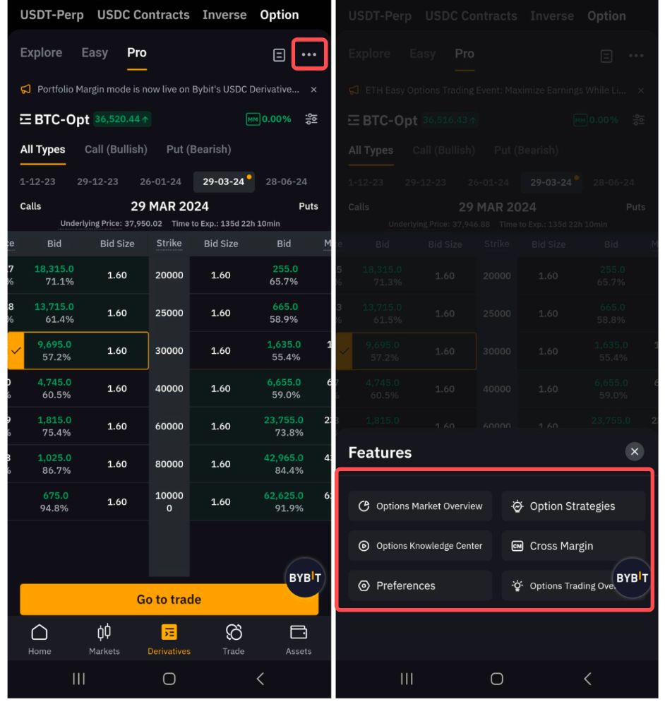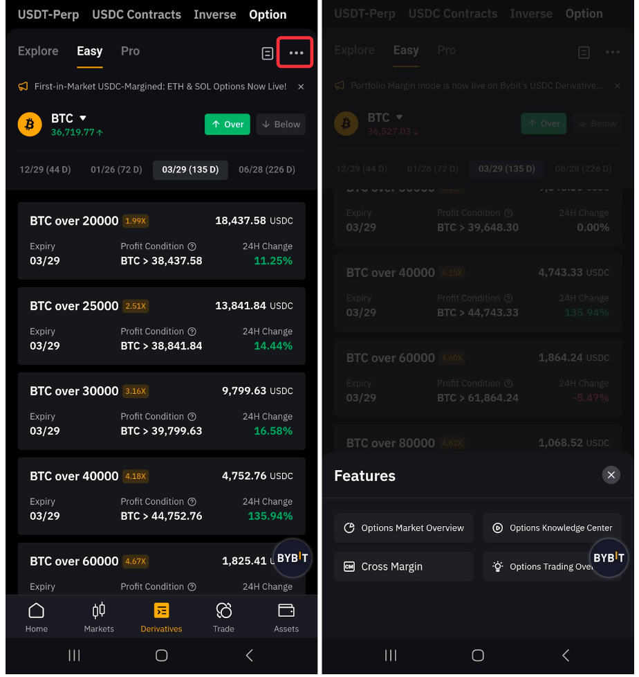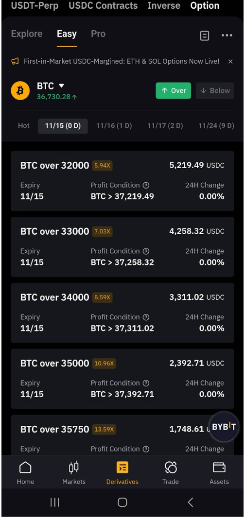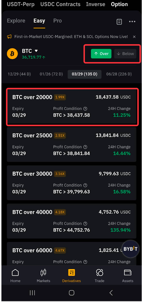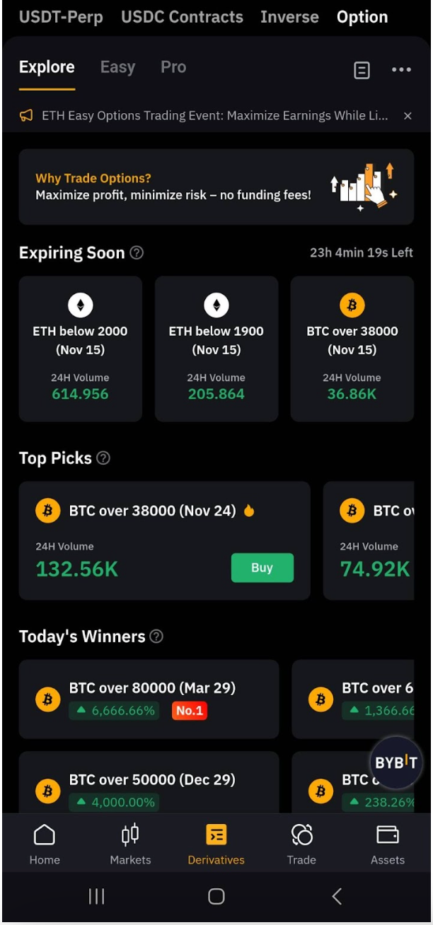 Para acceder a Opciones sencillas de Bybit, primero inicia la aplicación de Bybit. En la página de inicio, selecciona Derivados y pulsa Opción. Esto te llevará a la página Opciones de Bybit, donde podrá elegir entre tres modos en función de tu experiencia con el trading de opciones.