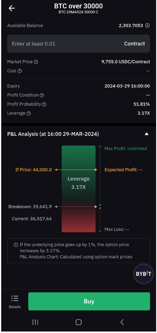 El gráfico del análisis de PyG presenta el precio de mercado actual, el PyG simulado basado en el precio de marca, el punto de equilibrio y las situaciones óptimas de PyG bajo simulación. Tras revisar los detalles, los traders pueden pulsar Comprar para adquirir el contrato.