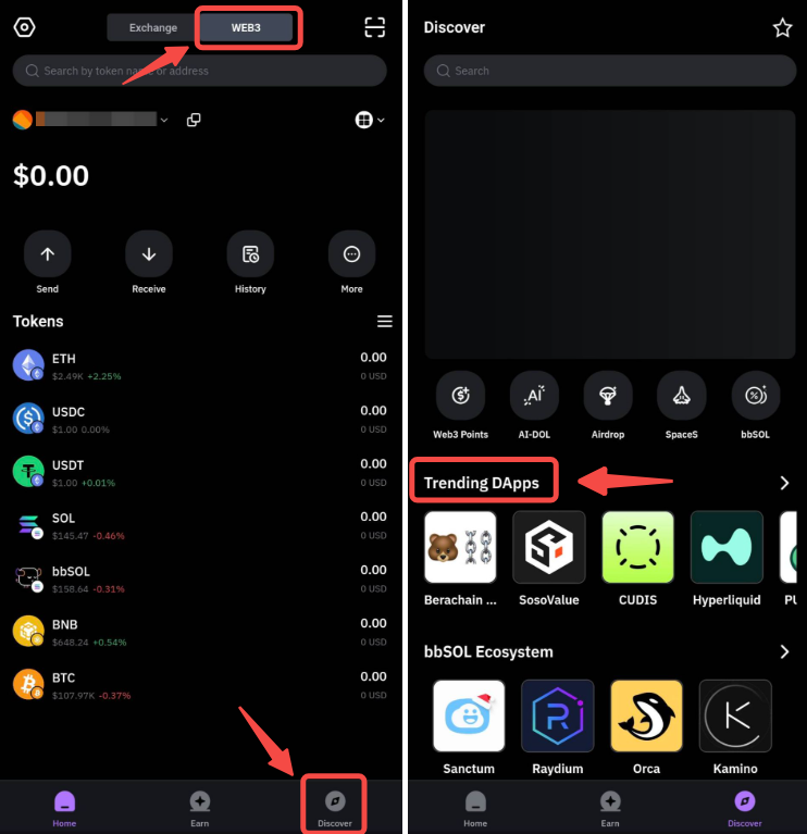 a) Abre la aplicación Bybit, ve a la página Billetera y pulsa en Descubre → Trending dApp.