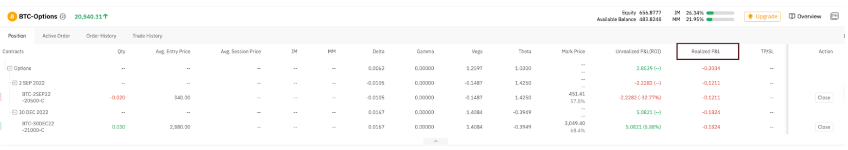 RPL ejecutada para la opción de compra = Máximo (Precio de ejecución - Precio Strike, 0) × Cantidad de la posición + Prima (recibir o pagar) - Tarifa de ejecución - Tarifa de trading (posición abierta)