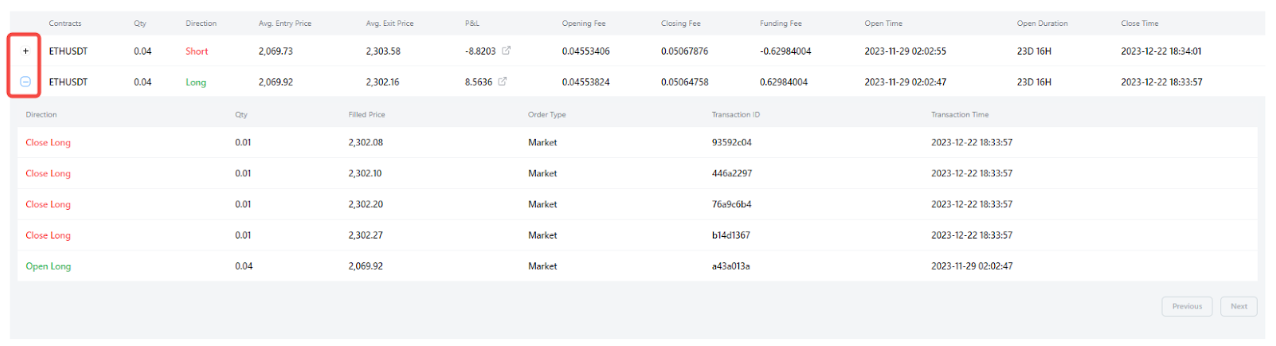 3) Para Posiciones Cerradas, puede revisar un registro completo de sus posiciones Cerradas Largas y Cortas. Incluye detalles desde la orden inicial de apertura hasta la orden final de cierre y muestra las PyG completas de esa posición calculadas en base al Precio Promedio de Salida.