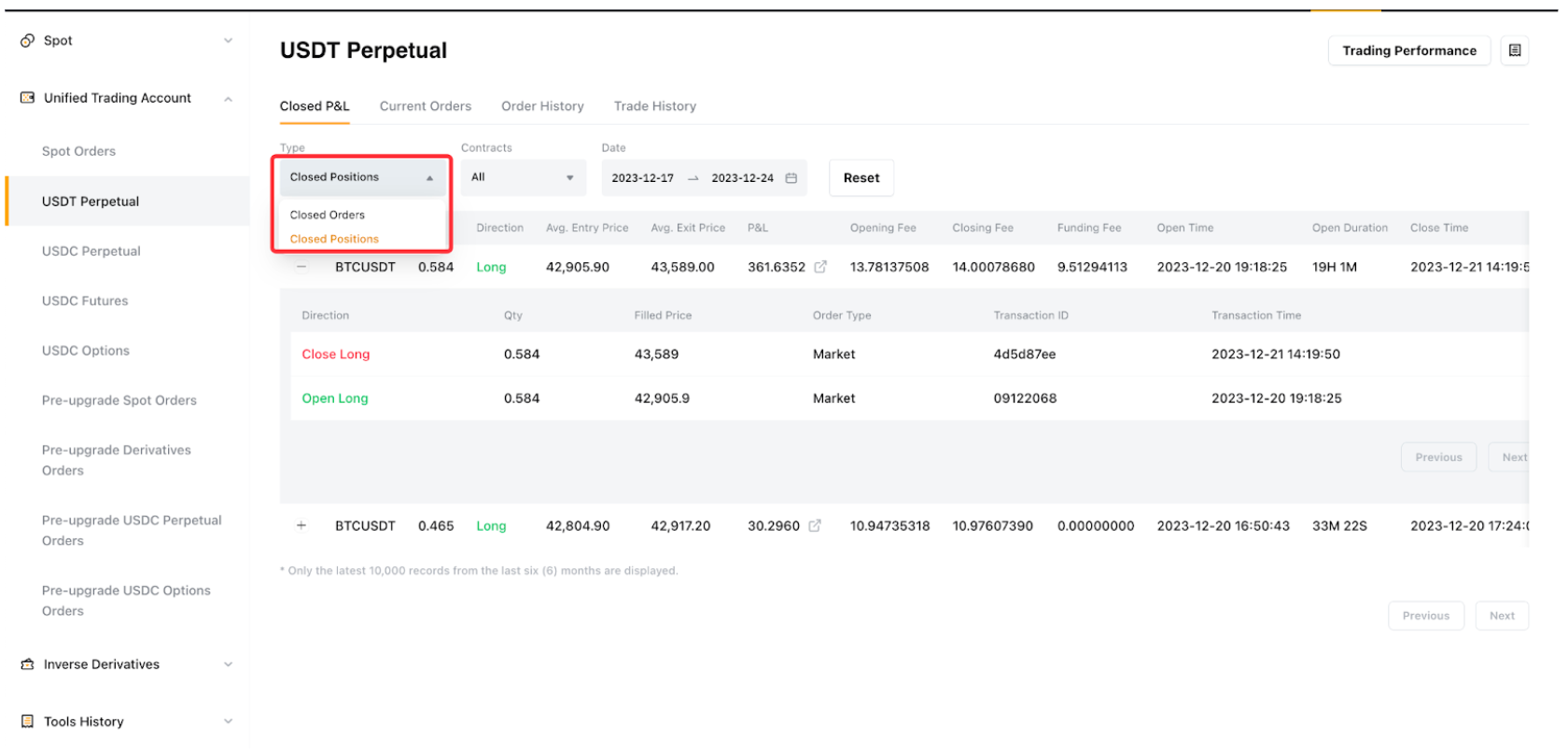 Se puede acceder a las PyG cerradas de cada posición haciendo clic en Órdenes Órdenes de derivados u órdenes de negociación unificadas → PyG cerradas y tiene las siguientes características clave.