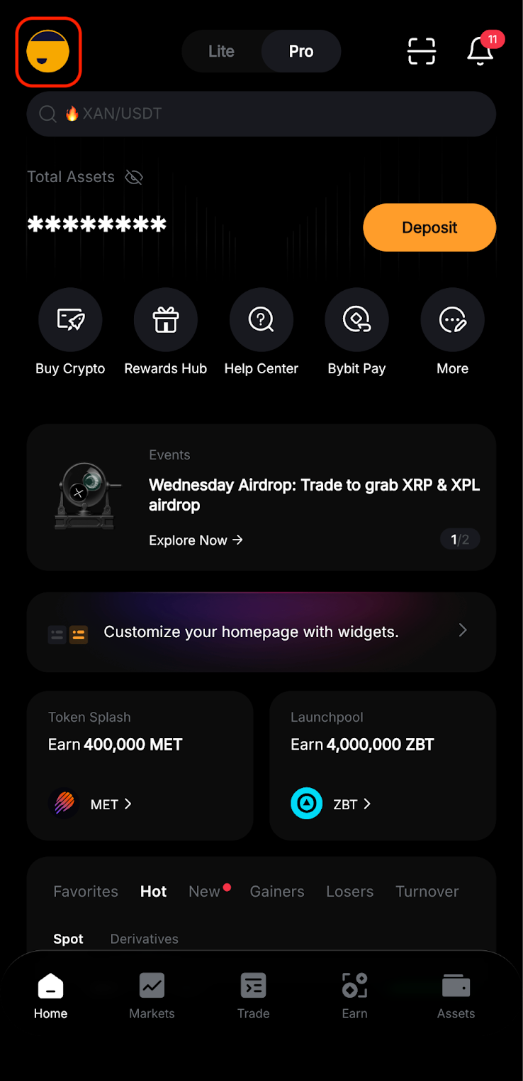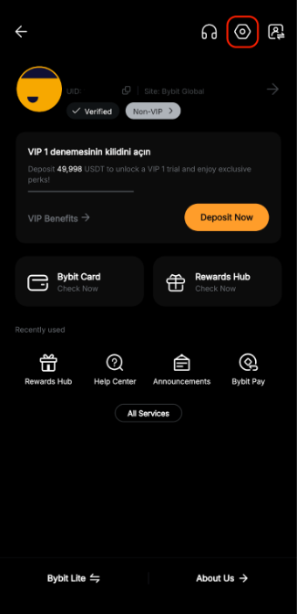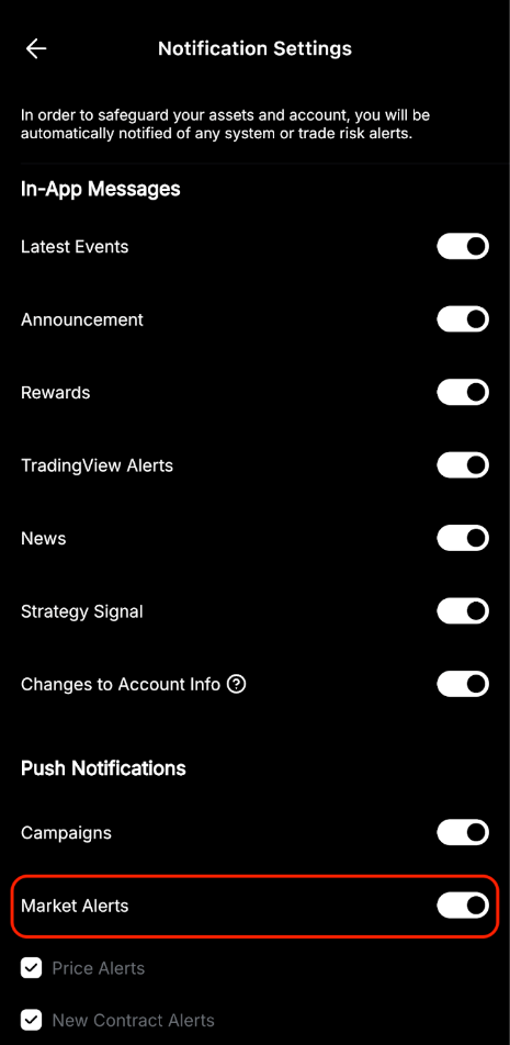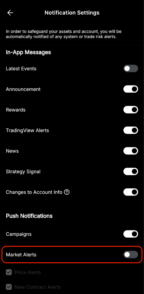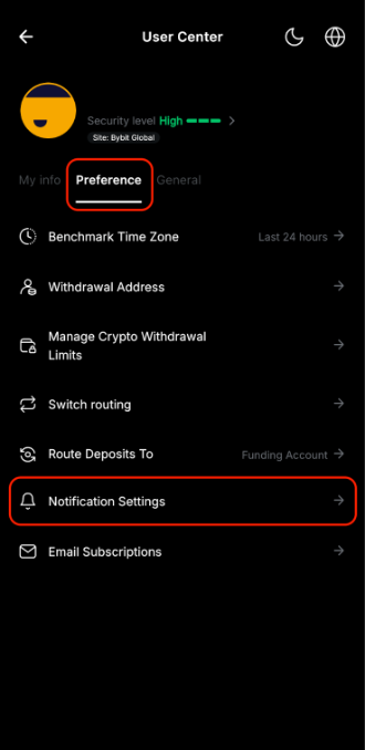 Para desactivar las Alertas de mercado de Bybit, puede ir a la página Configuración haciendo clic en el icono de perfil en la esquina superior izquierda de la página de inicio y haciendo clic en el icono Configuración. A continuación, haga clic en Preferencia → Configuración de notificaciones, donde puede definir el tipo de notificaciones que desea recibir en su teléfono desde la aplicación Bybit.