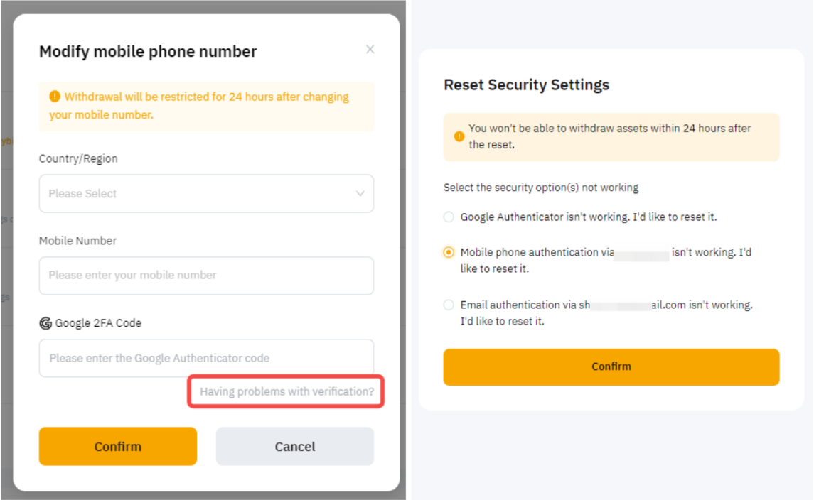 En la ventana de autenticación 2FA, puede hacer clic en Tengo problemas con la verificación para seleccionar el método de verificación que no funciona. Rellene la información y, una vez aprobada su solicitud, nuestro servicio de atención al cliente le ayudará a restablecer su autenticación 2FA.