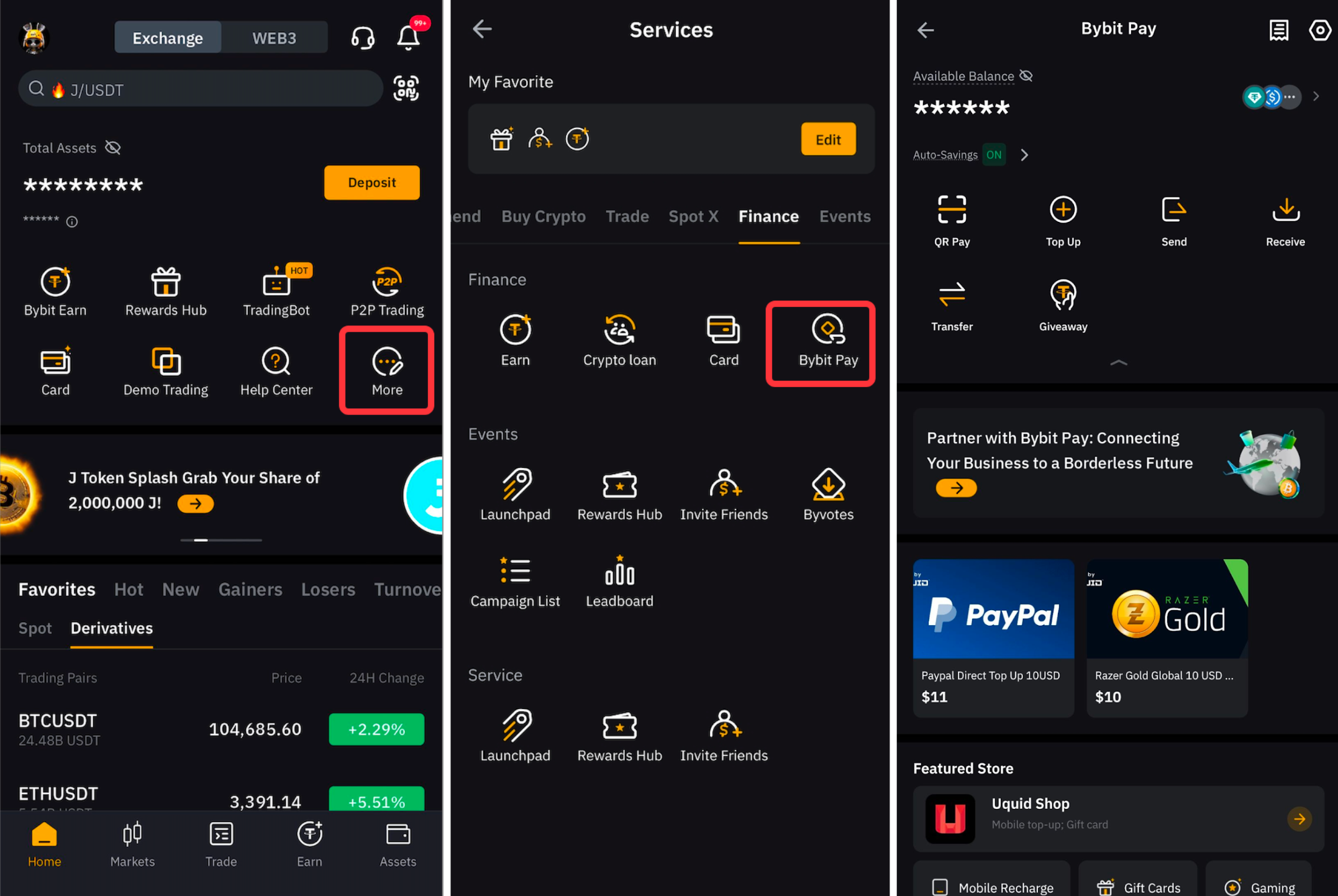 Si estás en la aplicación Bybit, primero inicia la aplicación Bybit e inicia sesión en tu cuenta. Toca en Más en la página de inicio y, a continuación, toca en Bybit Pay.