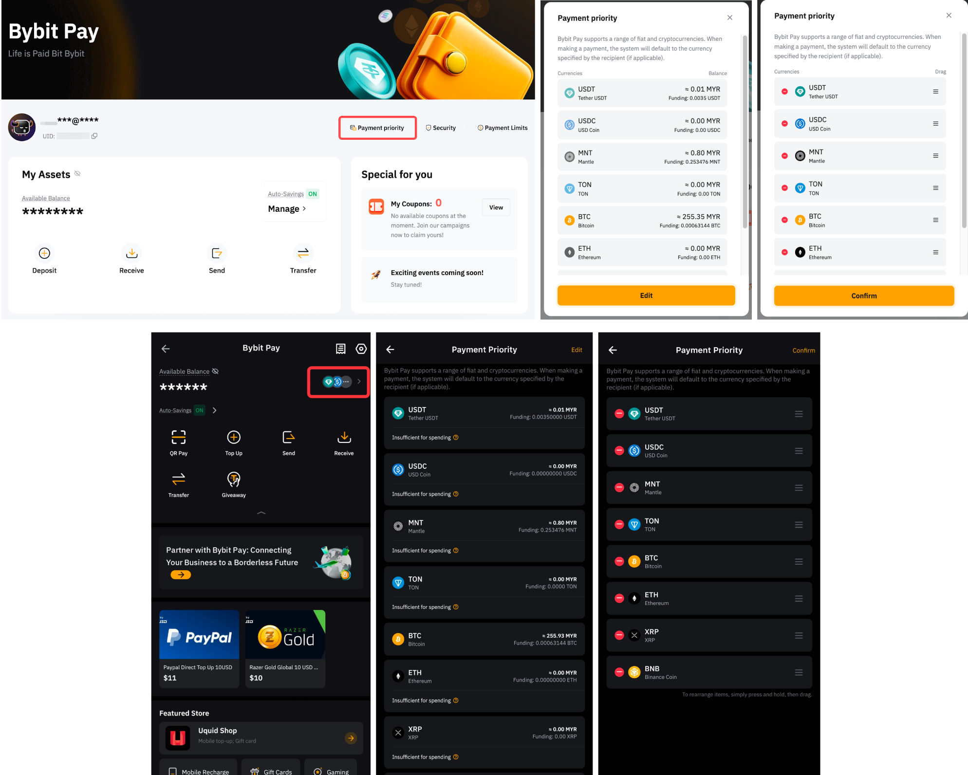 Ve a la página Pago de BybitPrioridad de pagoEditar Toca el botón eliminar/añadiry arrastra para ajustar las secuencias.