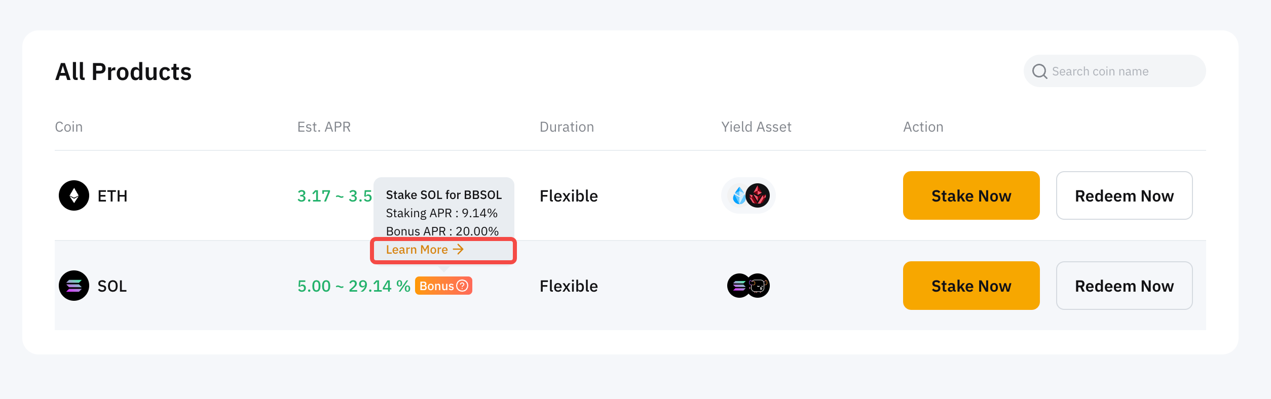 On-Chain Earn de Bybit es un servicio de staking fácil de usar en el que puedes hacer staking con tus criptomonedas directamente en la cadena de bloques y ganar recompensas. Apoya a las redes proof-of-stake (PoS), contribuyendo así a su seguridad y descentralización. El staking tradicional requiere experiencia técnica y cierto hardware. Con On-Chain Earn de Bybit no tienes que preocuparte por las tarifas de gas, las operaciones de nodo ni la distribución de las recompensas. Puedes hacer staking fácilmente con tokens PoS populares como Ethereum (ETH) y Solana (SOL) con solo unos clics.