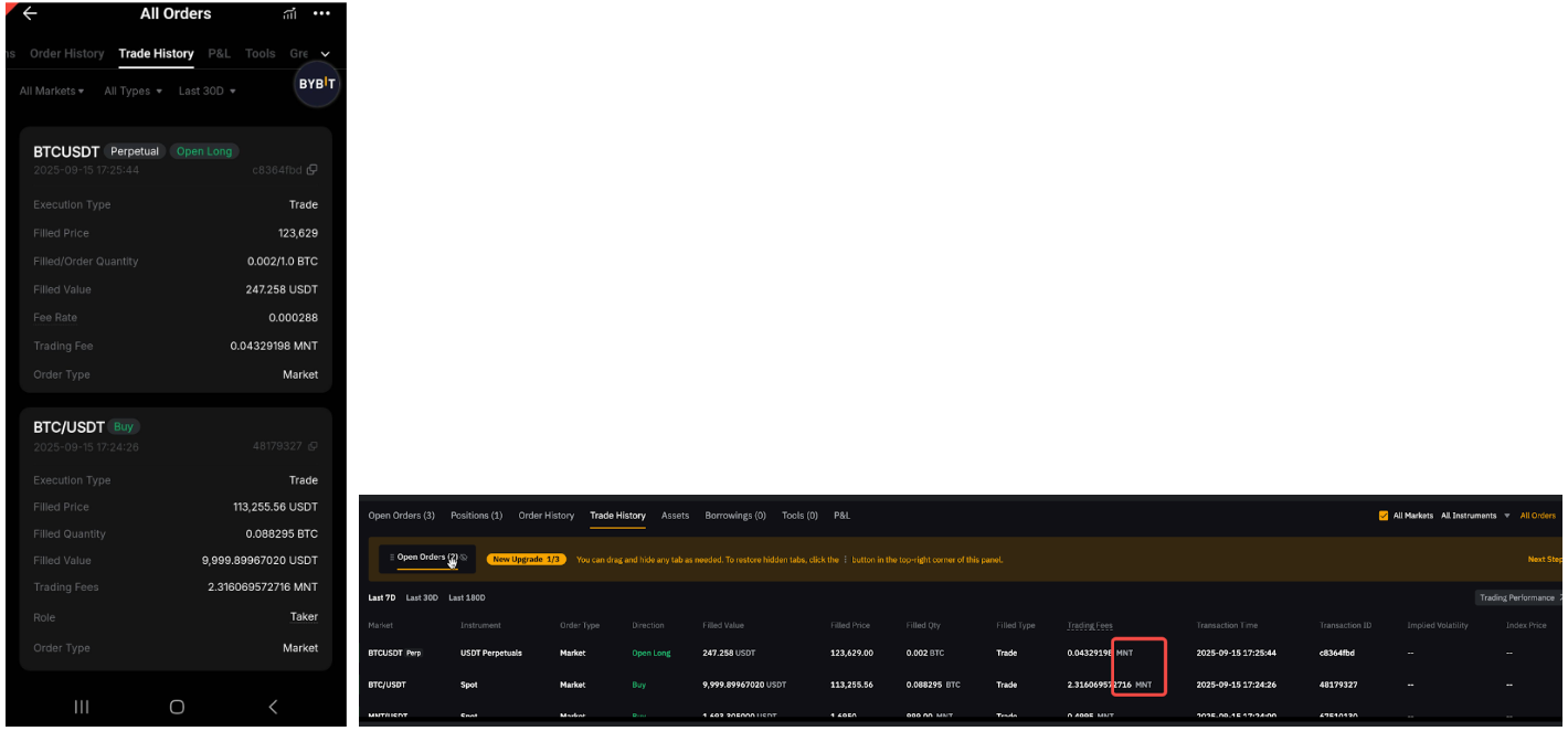 Puedes usar MNT para pagar tarifas de trading de todos los pares de trading en Spot Trading, Spot Margin Trading, contratos de USDT perpetuo y con vencimiento y contratos de USDC perpetuo y con vencimiento. Esto también se aplica al trading previo al mercado. No se pueden usar en contratos inversos.