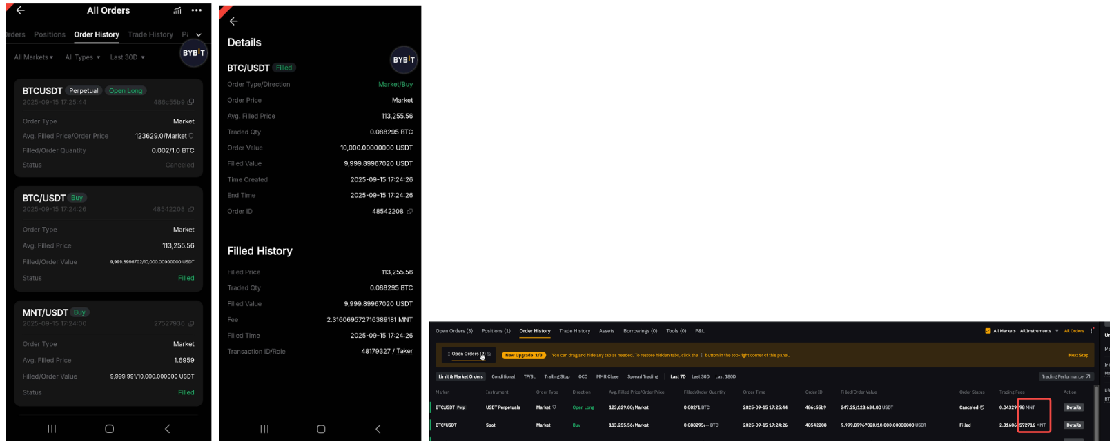 Si pagas tarifas de trading con MNT, tienes los detalles en tu Historial de trading y tu Historial de órdenes. Ten en cuenta que el Historial de órdenes puede mostrar varias entradas de tarifas para una sola orden si se ejecutó mediante varios trades.