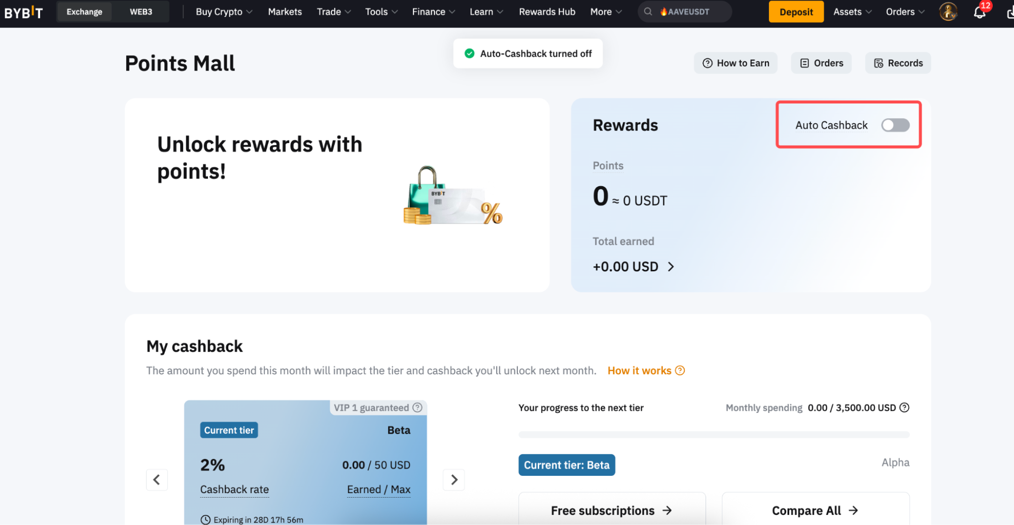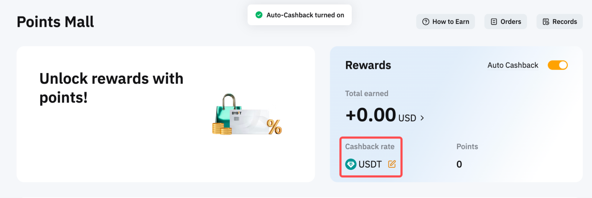 Paso 4: Después de activar correctamente el reembolso automático, notarás que los puntos Bybit se han habilitado para el reembolso automático en el panel de pago de Bybit. Los puntos se convertirán al token seleccionadoy se acreditarán en tu cuenta de fondos todos los días entre las 00:00 y la 01:00 UTC.