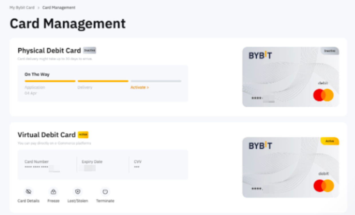 Después de verificar tu CVV, ¡ahora puedes usar tu Bybit Card física! Puedes administrar tu Bybit Card virtual y física en la página Administración de tarjetas.