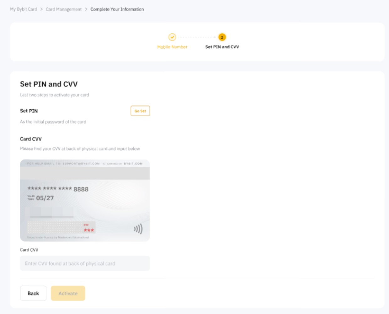 Paso 5: Introduce el CVV de 3 dígitos en el reverso de tu Bybit Card física y haz clic en Activar.