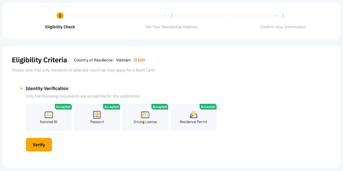 Nota: La Bybit Card tiene requisitos más estrictos para la verificación de identidad. Por lo tanto, es posible que deba actualizar su verificación de identidad aunque ya la haya completado en su cuenta de Bybit anteriormente.