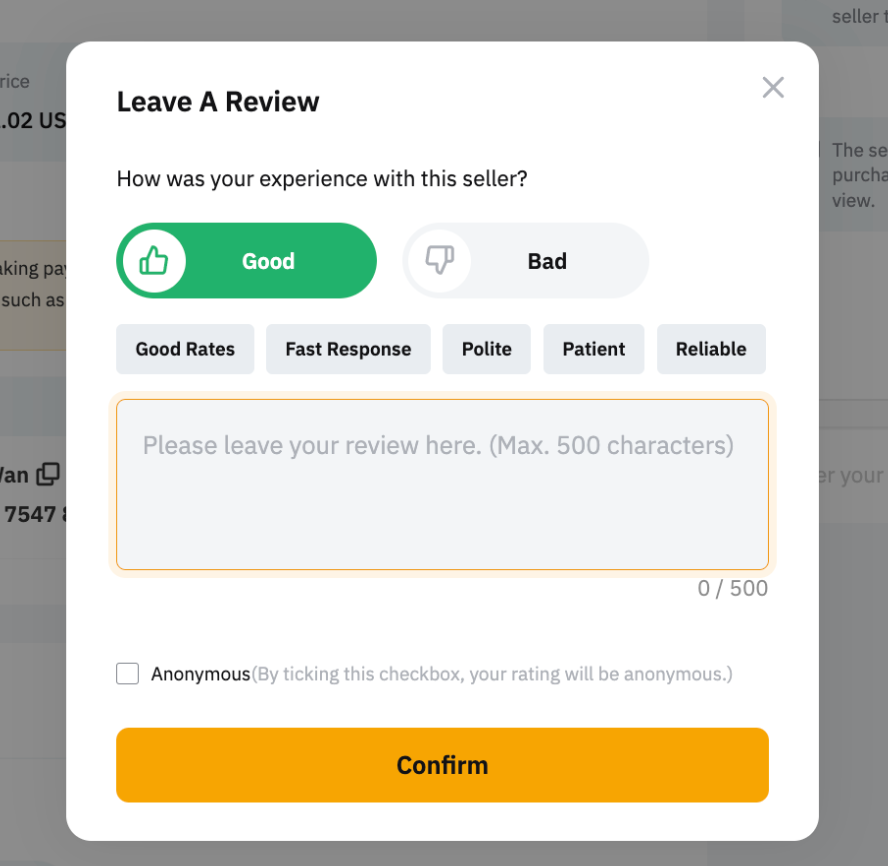 Puedes optar por dejar reseñas de forma anónima, lo que significa que tus contrapartes no sabrán quién las envió. Para enviar una reseña, simplemente haz clic en Confirmar después de terminar de escribir.