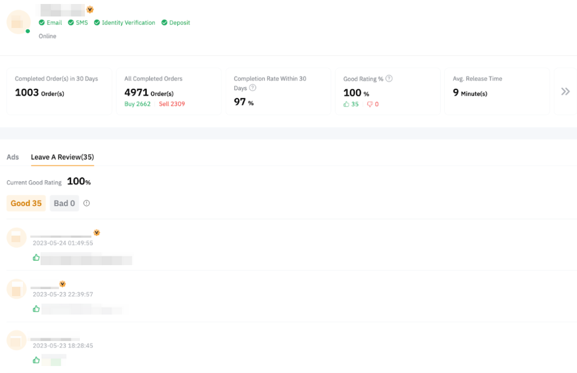 — Los usuarios pueden dejar una revisión para su contraparte solo para una orden P2P completada. Solo se puede dejar una reseña por usuario, en función de su experiencia de trading real.