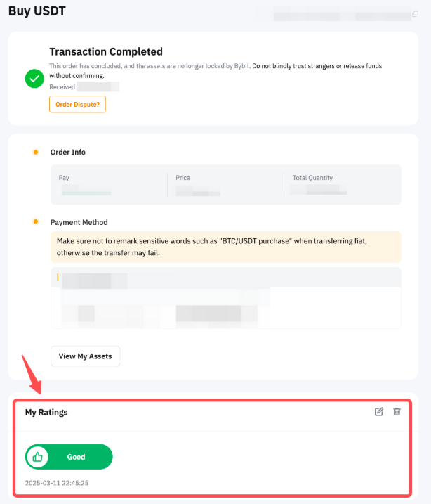 Paso 2: Además de valorar su experiencia comercial, la función de valoración de Bybit P2P también le permite dejar valoraciones de su contraparte comercial.