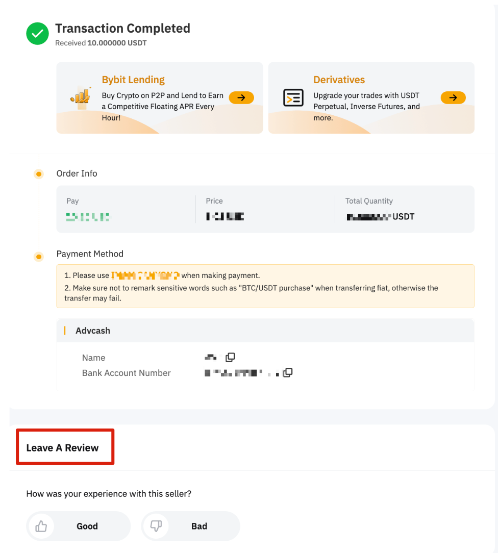 La función de revisión P2P añadida por Bybit es una gran manera para que los usuarios compartan sus comentarios sobre su experiencia comercial. Esta función permite a los usuarios dejar reseñas de sus contrapartes comerciales, lo que puede ayudar a otros usuarios a tomar decisiones informadas al seleccionar anuncios P2P para mejorar la experiencia general de los usuarios P2P de Bybit.