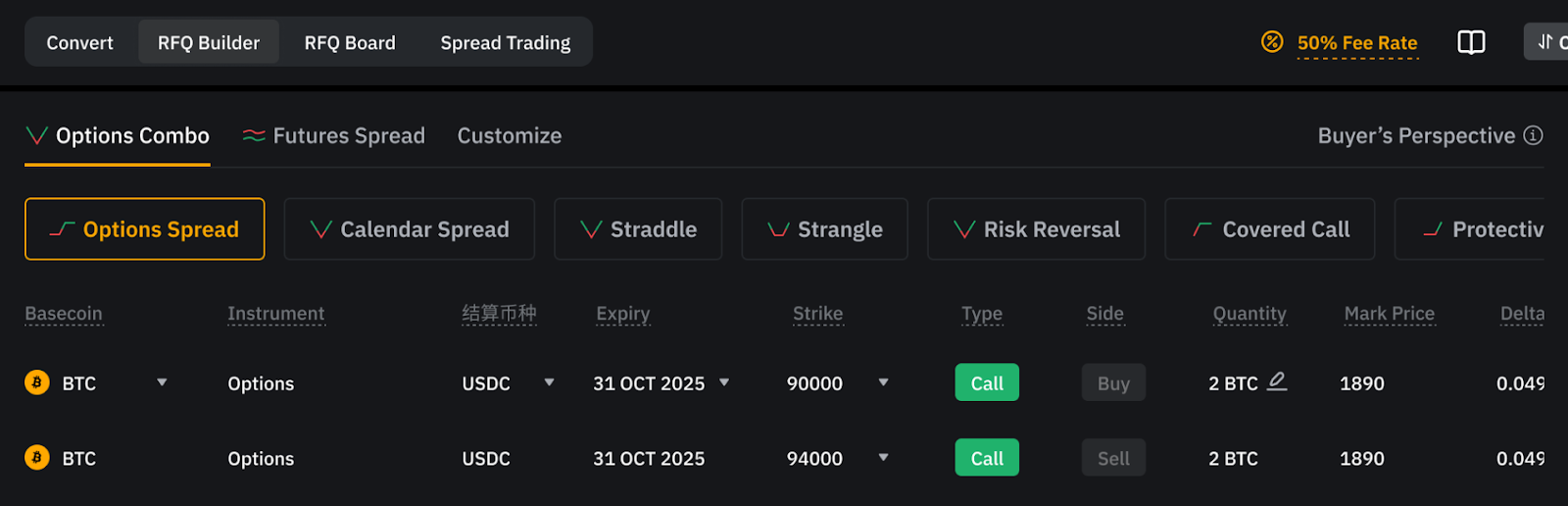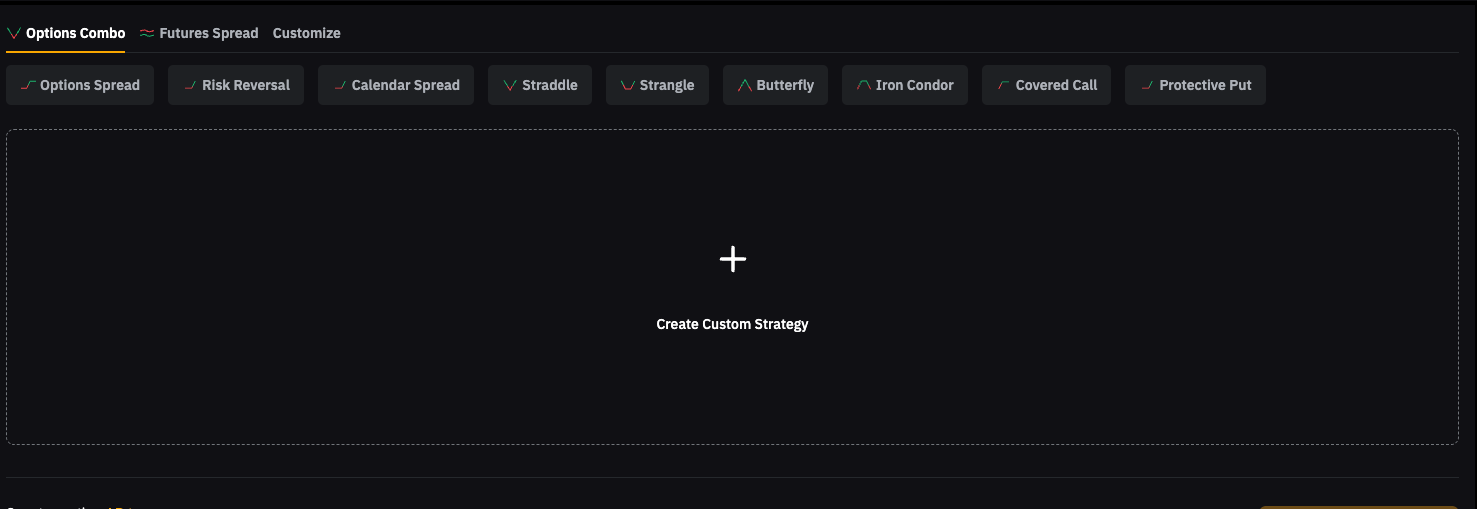 • Combo de Opciones: Selecciona entre las estrategias de Opciones preestablecidas y configura detalles como las monedas, el vencimiento y la cantidad.
