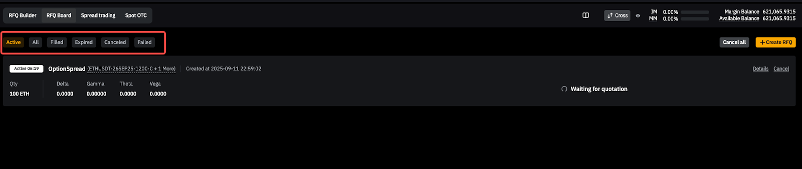 Una vez que hayas enviado una RFQ, puedes rastrearla y ver las cotizaciones de los proveedores de liquidez en el Panel de RFQ.