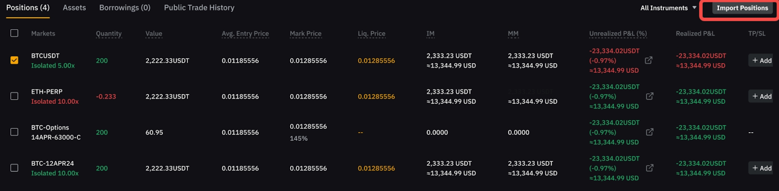 Paso 2: Selecciona la posición que deseas cerrar. El botón Importar posición estará disponible en la esquina superior derecha de la sección inferior.