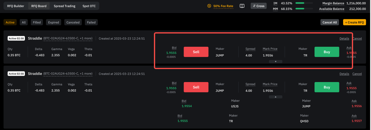 Paso 2: En la pestaña Activa, verás las mejores ofertas y ventas para tu RFQ. Haz clic en el icono Expandir para ver hasta tres de las cotizaciones más competitivas y, a continuación, haz clic en Comprar o Vender para aceptar una cotización.