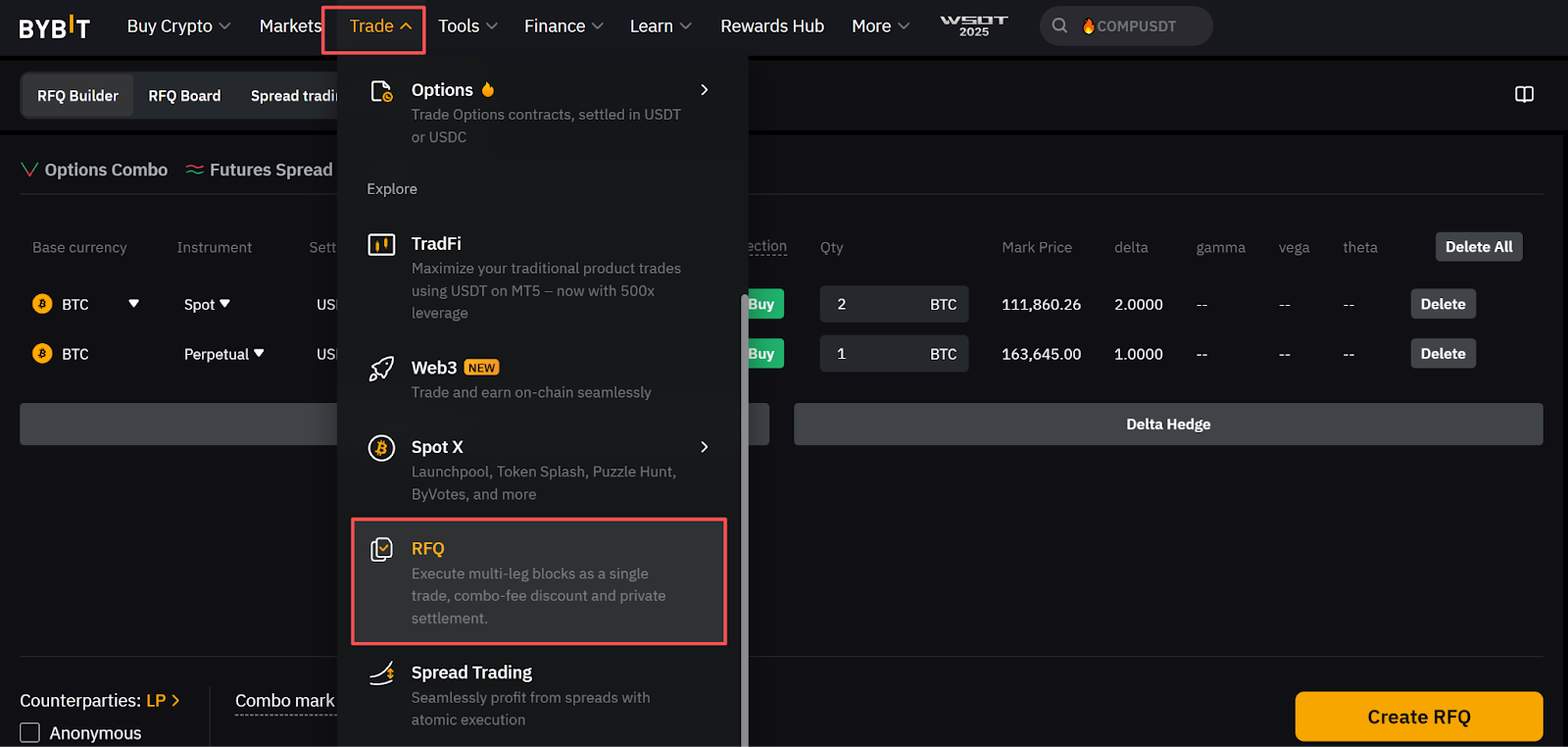 Paso 1: Inicia sesión en el sitio web de Bybit y haz clic en TradeRFQ en la barra de navegación para acceder a la página de RFQ.