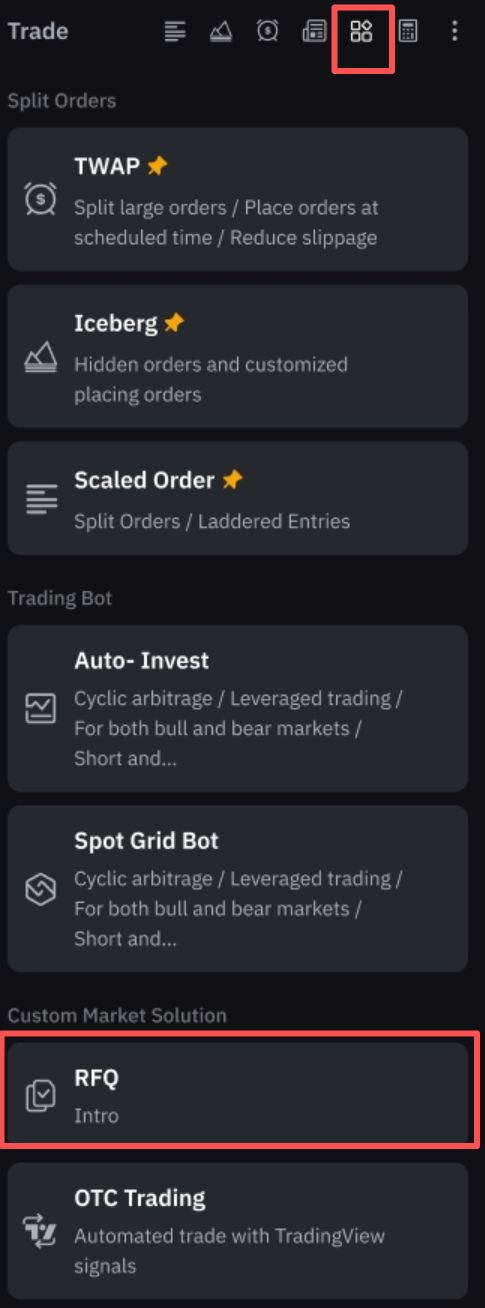 También puedes acceder a RFQ en la página de trading en Spot/Futuros. Para ello, haz clic en el icono Herramientas del panel Trade situado a la derecha.