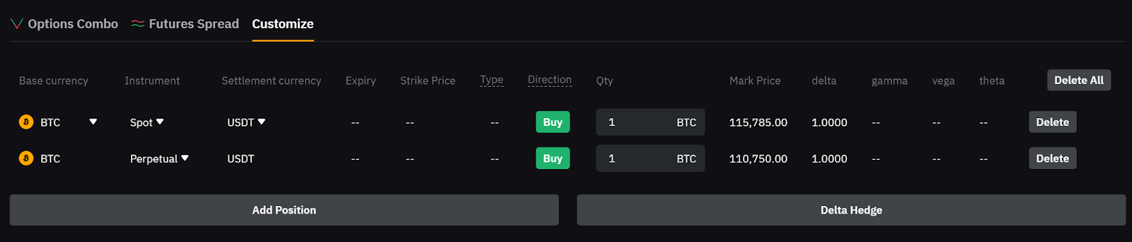 — Para compensar el riesgo, haz clic en Cobertura Delta y el sistema añadirá automáticamente una posición de cobertura.