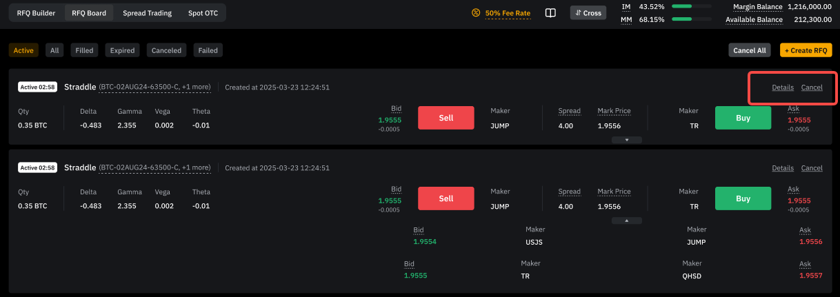 • RFQ Builder: Crea estrategias y envía RFQ a los proveedores de liquidez.