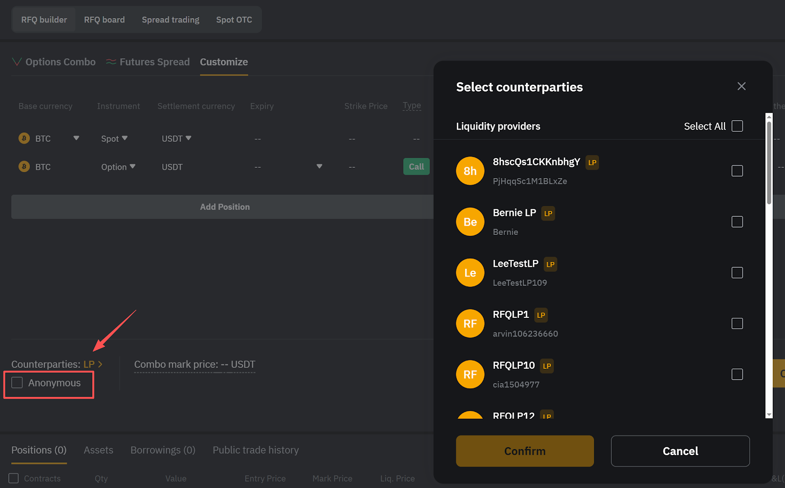 Paso 6: Después de configurar tu estrategia, haz clic en LP en la parte inferior izquierda para seleccionar una o más contrapartes. Para garantizar la máxima confidencialidad, marca la casilla Anónimo.