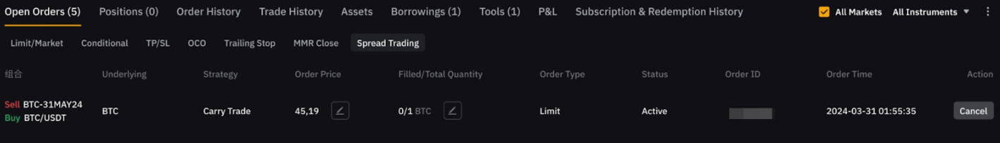 Para comprobar las órdenes activas, ve a Órdenes abiertas en la parte inferior y selecciona Spread Trading. Aquí encontrarás detalles clave como la combinación, el activo subyacente, el precio de la orden y más.