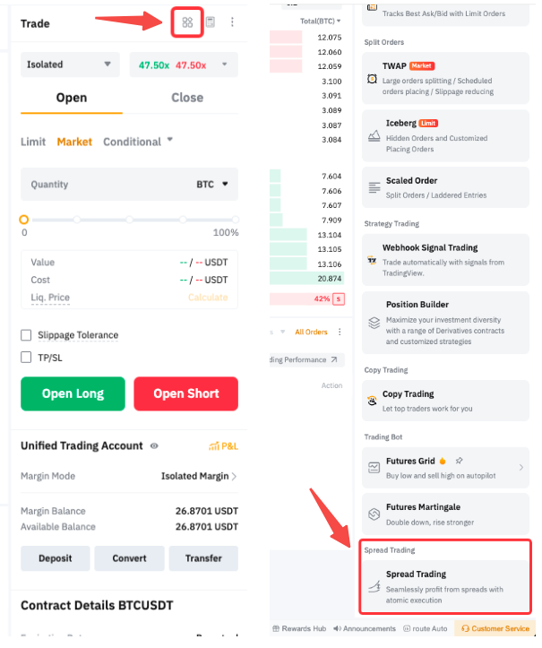 También puedes encontrar Spread Trading en la pestaña Herramientas en el panel derecho de la página de trading Spot/Futures.