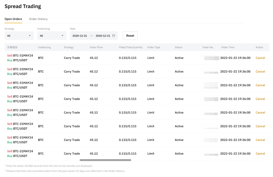 Puedes acceder a tus órdenes de Spread Trading desde cualquier página de trading, incluidas Spread Trading, Spot y Futuros, ya que todas comparten los mismos datos de órdenes.