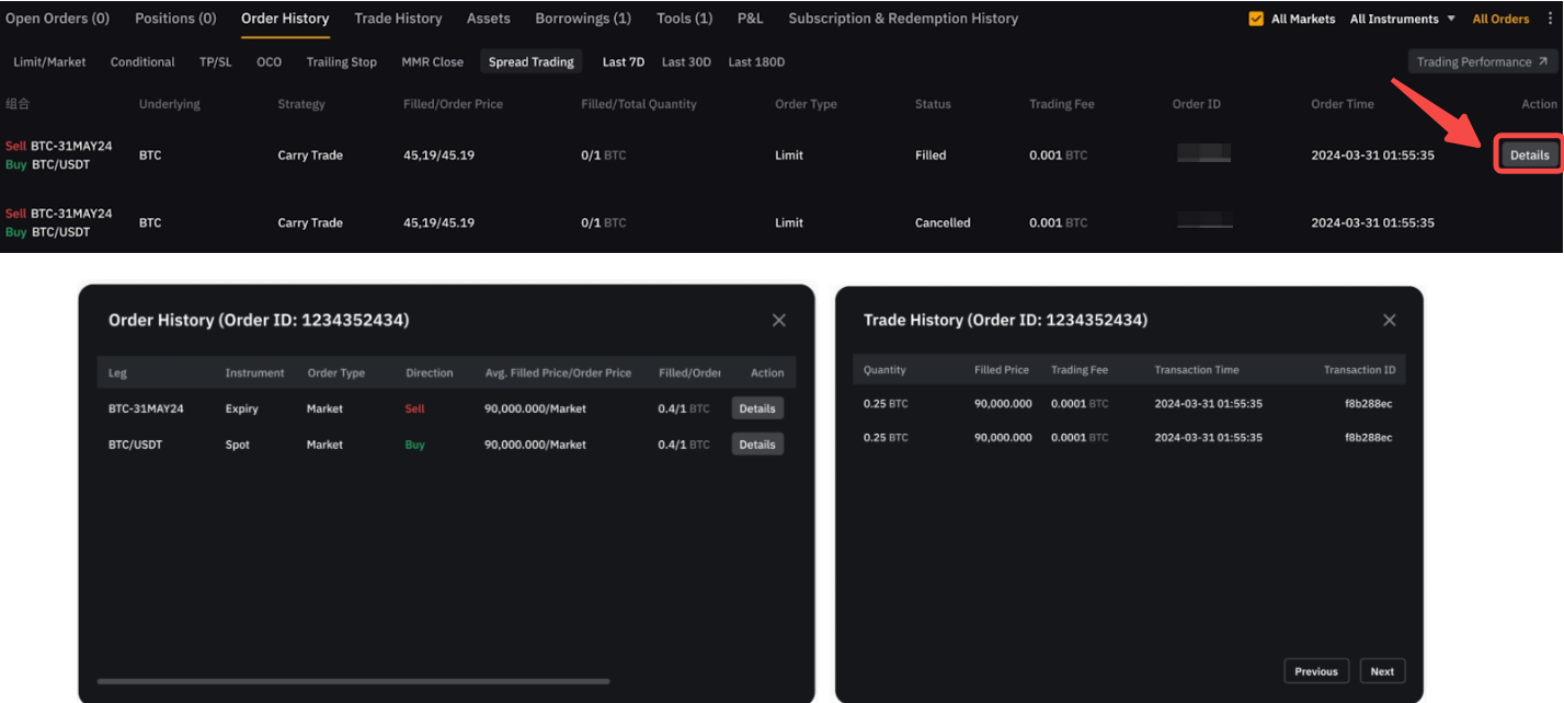 Para órdenes completadas, navega hasta Historial de órdenes y haz clic en Spread Trading. Haz clic en Detalles bajo Acción para ver la información de la orden en cada tramo. Haz clic de nuevo en Detalles para obtener información adicional.