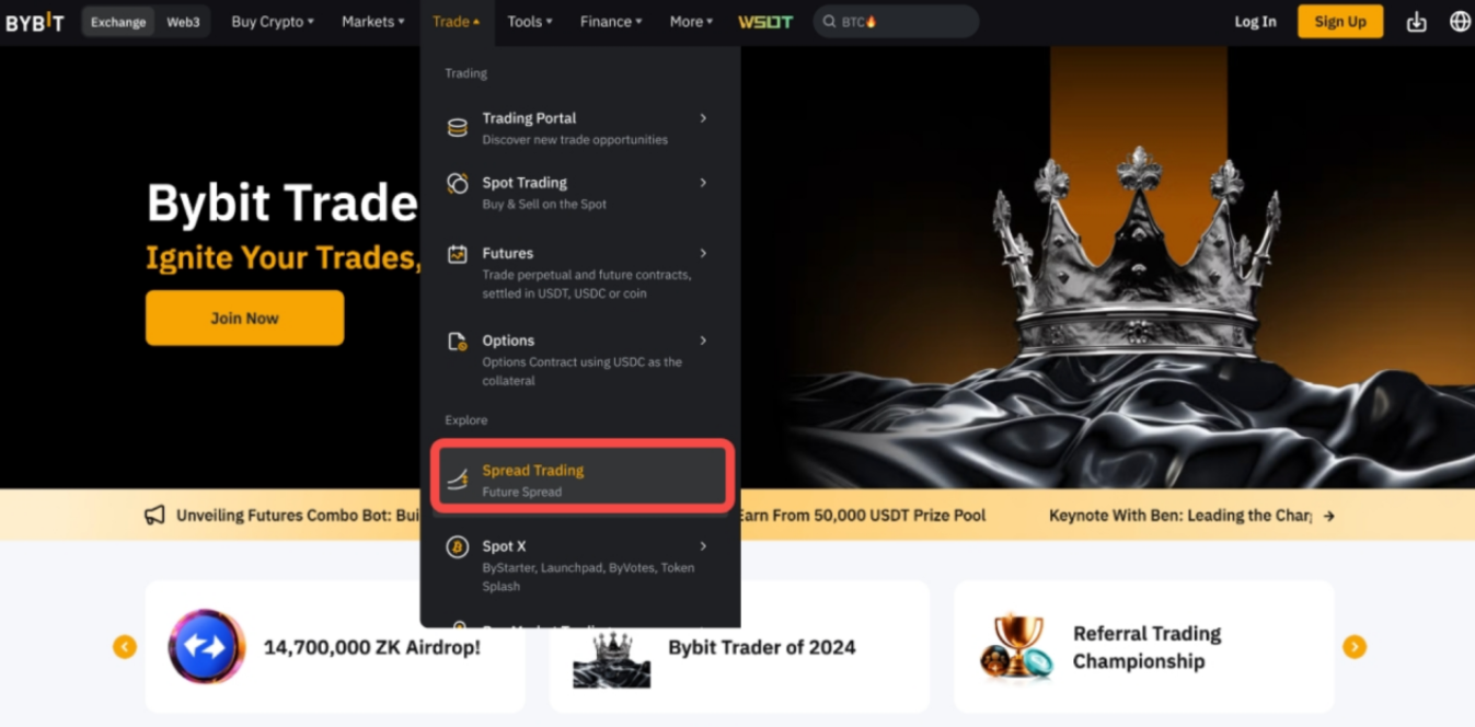 Paso 1: Inicia sesión en el sitio web de Bybit y haz clic en Trade → Spread Trading en la barra de navegación para acceder a la página Spread Trading.